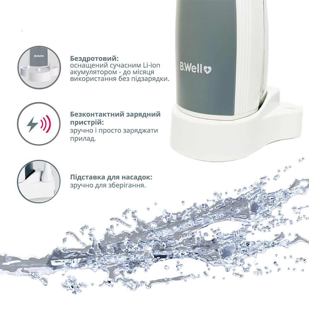 Ирригатор для полости рта B.Well TH-912 - профессиональный прибор для ухода за зубами и деснами, доступный в каждом доме. Продуманная конструкция, простое управление с помощью двух кнопок, удобный способ наполнения водой, и современное бесконтактное зарядное устройство. Легкий и компактный ирригатор TH-912 обладает мощностью сопоставимой с лучшими стационарными моделями. Оснащен литий-ионным аккумулятором, в котором отсутствует «эффект памяти», снижающий со временем емкость устройства. Заряда литий-ионного аккумулятора хватает на длительное время - до 60 минут.