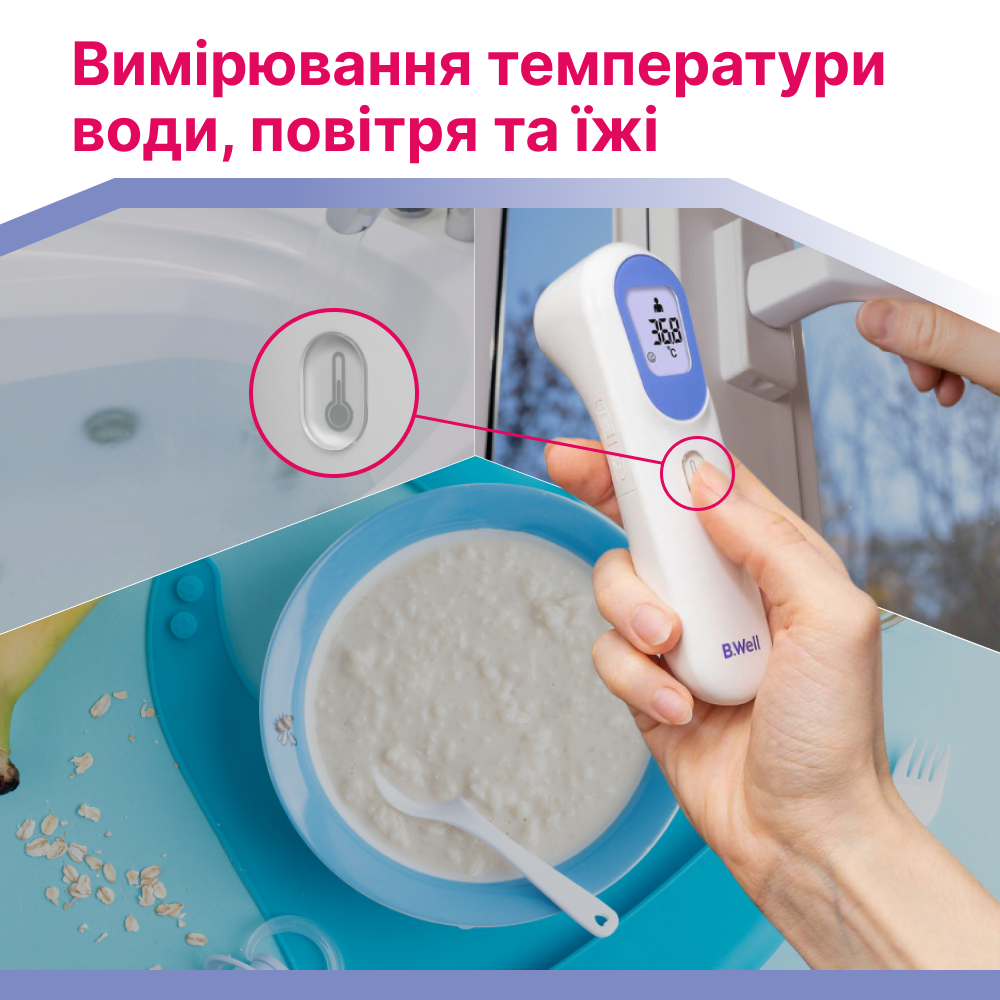 B.Well TH-7000 — это современный помощник для всей семьи, который всего за мгновение измерит температуру тела, воздуха или даже детского питания. Благодаря инновационному датчику расстояния прибор сам выбирает идеальное положение для измерения (~3 см), обеспечивая точный результат без лишних усилий. А ночной режим с подсветкой и бесшумной работой делает проверку температуры комфортной даже для спящего ребёнка.