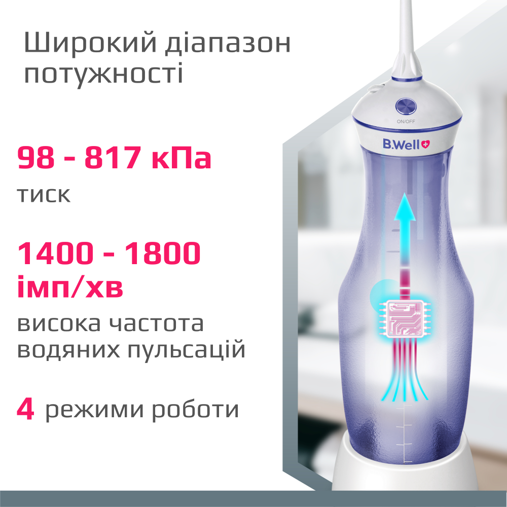 Мощность и частота пульсации ирригатора B.Well TH-917 не уступают стационарному прибору, что гарантирует высококачественную гигиену полости рта и выполнение задачи на 100%. Ирригатор для полости рта B.Well TH-917 имеет 4 режима работы: эффективное очищение, для чувствительных зубов и десен, оздоровительный массаж и индивидуальный режим настройки мощности. Персональный режим позволяет адаптировать портативный ирригатор под ваши требования и субъективные ощущения.