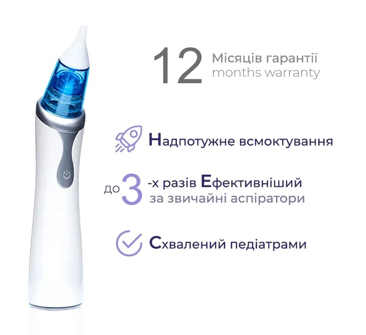- Містить 3 силіконові насадки для безпечного очищення дитячого носика на різній глибині;