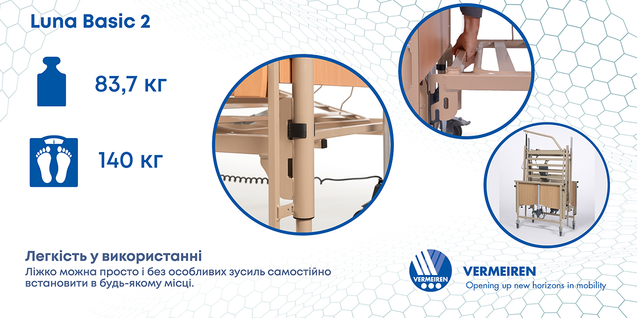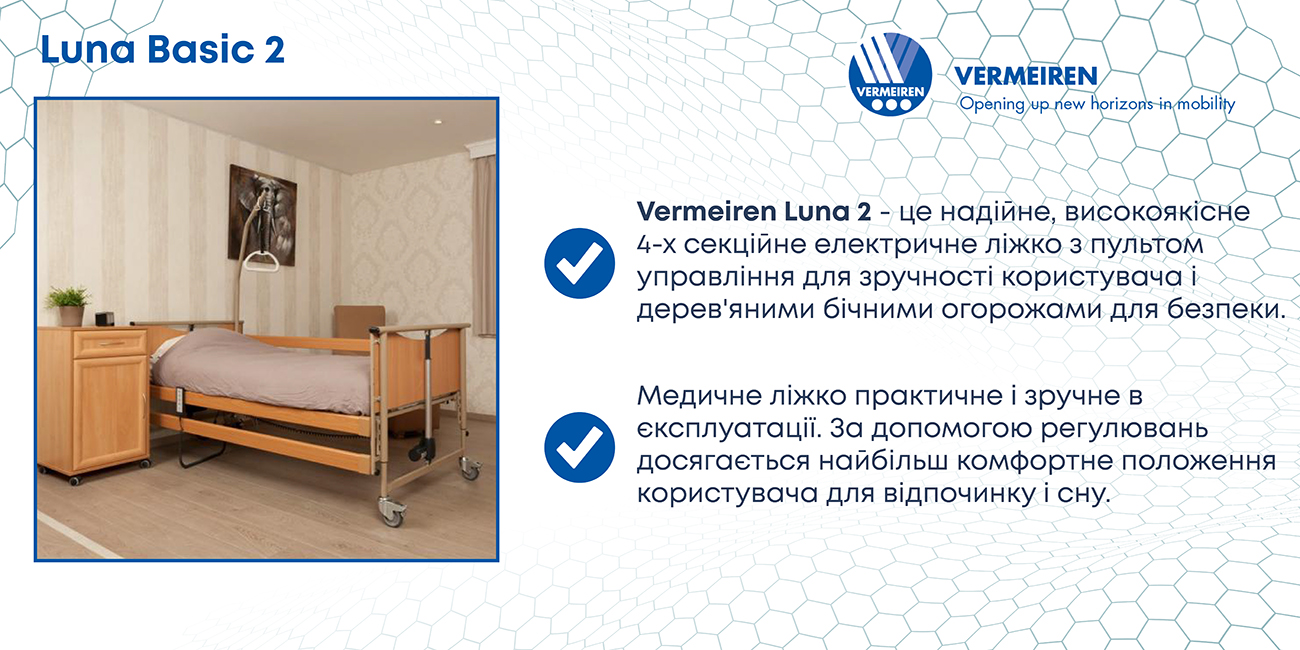 Ліжко функціональне Luna Basic 2 Vermeiren для лежачих пацієнтів призначене для догляду за людьми з обмеженими можливостями, як у домашніх умовах, так і в умовах стаціонару. Практична та зручна у користуванні, а за допомогою регулювань досягається найбільш комфортне становище користувача для відпочинку та сну. Регульоване по висоті 4-х секційне ложе, в якому одна секція фіксована (тазова) та три секції з електричними регулюваннями кута нахилу. Всі металеві деталі ліжка пофарбовані порошковим методом, оцинковані і хромовані. Бічні огорожі, узголів'я, підніжжя ліжка для лежачих хворих виконані з деревних матеріалів, ретельно та ретельно відполіровані.