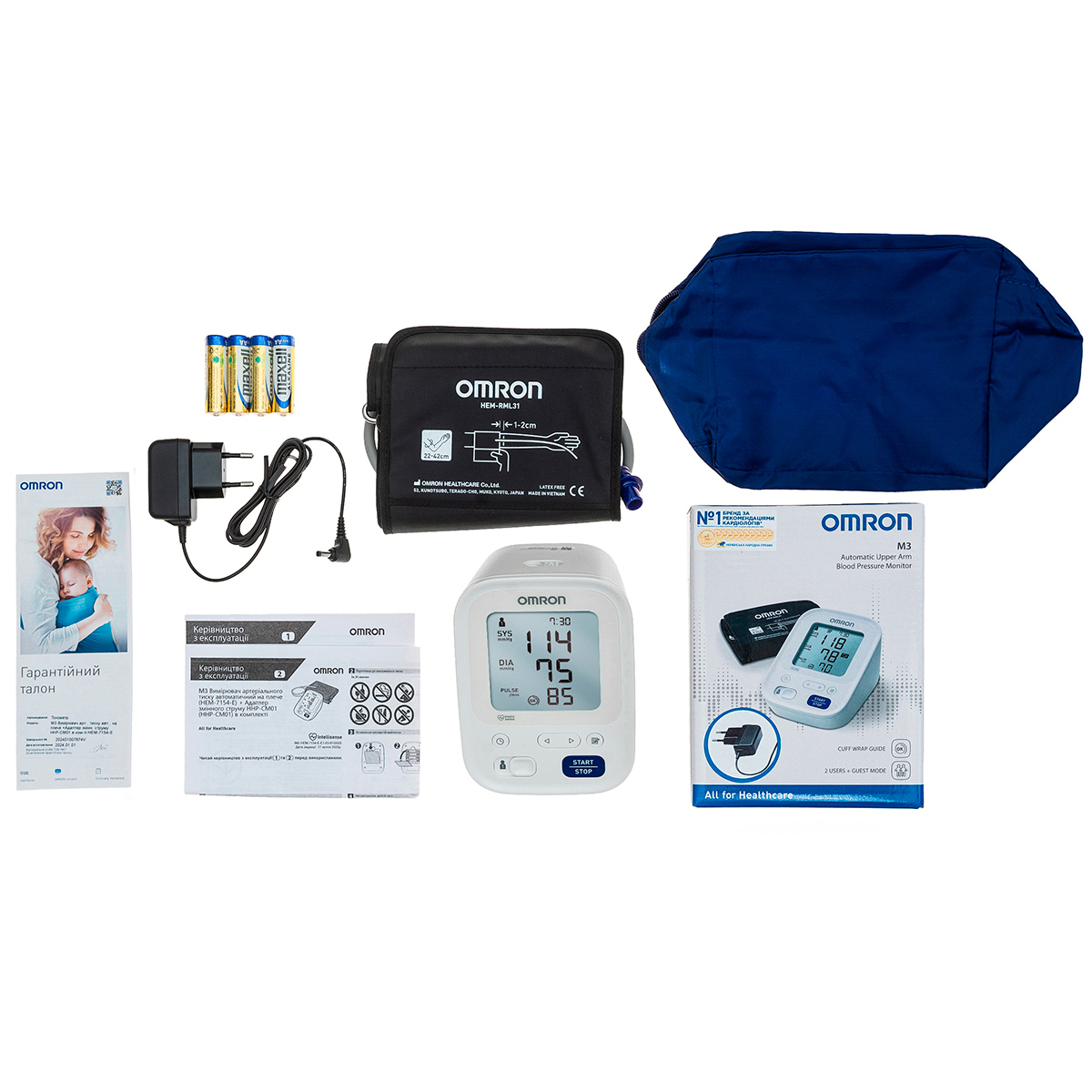 OMRON M3 – це автоматичний тонометр з плечовою манжетою, зручний у використанні та доступний за ціною. У комплект входить універсальна манжета (22-42 см), що підходить для всіх членів сім'ї, а також адаптер для роботи від мережі, що робить використання приладу ще комфортнішим.