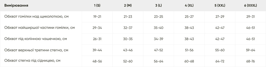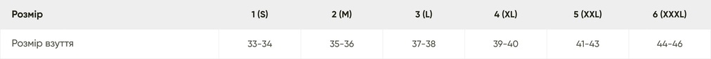 Підбір здійснюється за таблицею розмірів; додатково можливий вибір за розміром взуття.